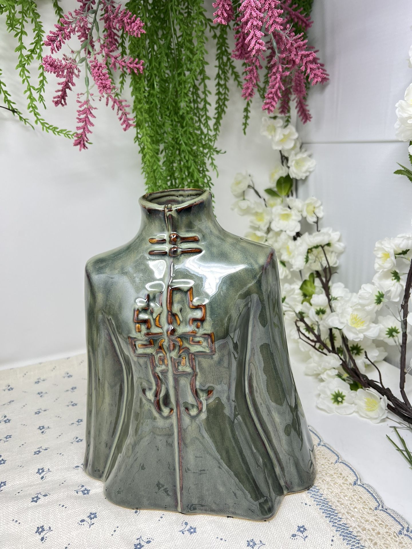 Large mid-20th century ceramic vase in kimono/robe form with beautiful green glaze. Excellent condition – no chips, no cracks.