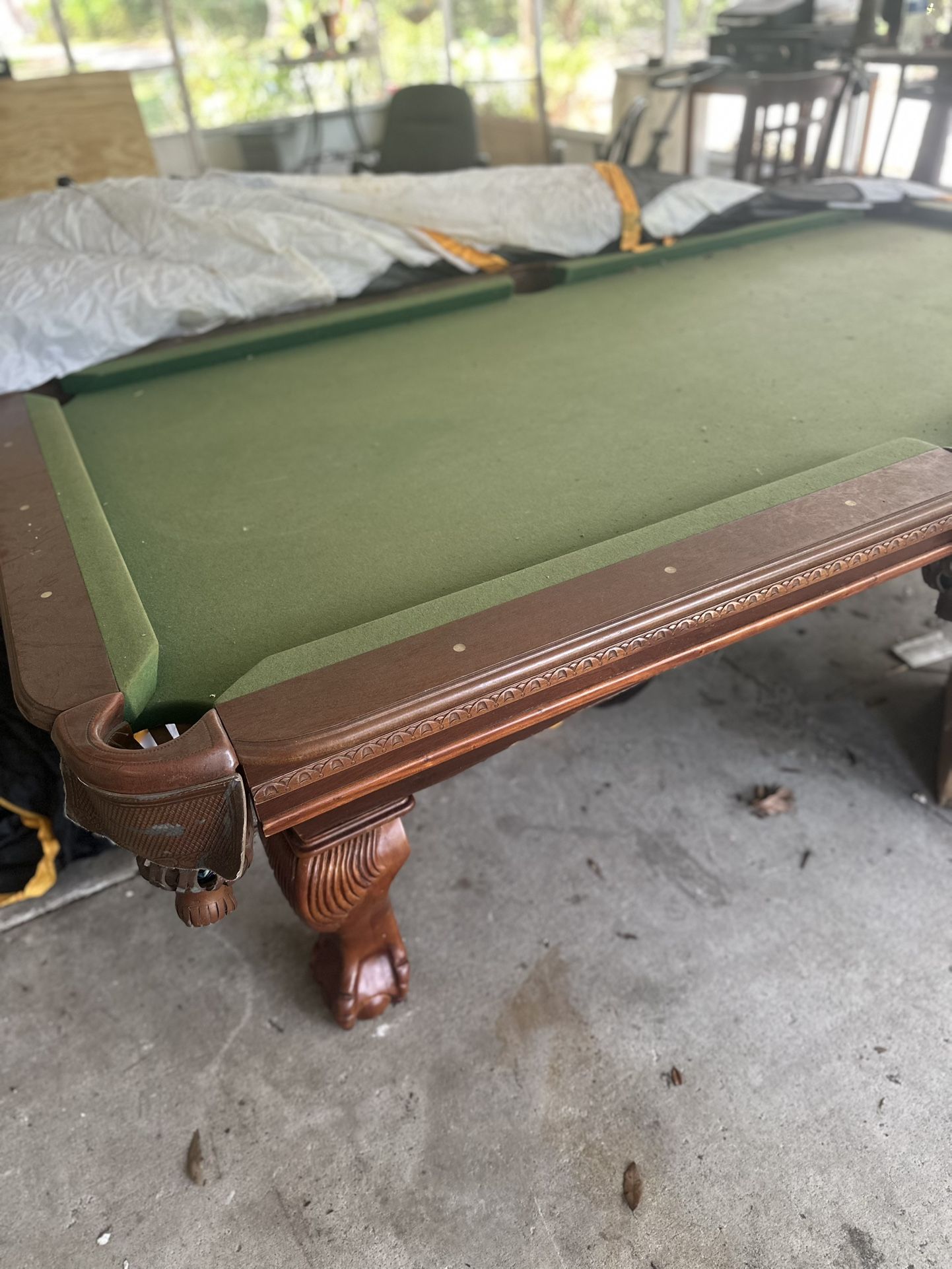 Real wood, always kept under the tarp shown in the picture. The table is completely level and in excellent condition. The green is slightly faded, but the functionality is a 10/10. This is a classic and well made pool table, not the cheap crap they make nowadays .