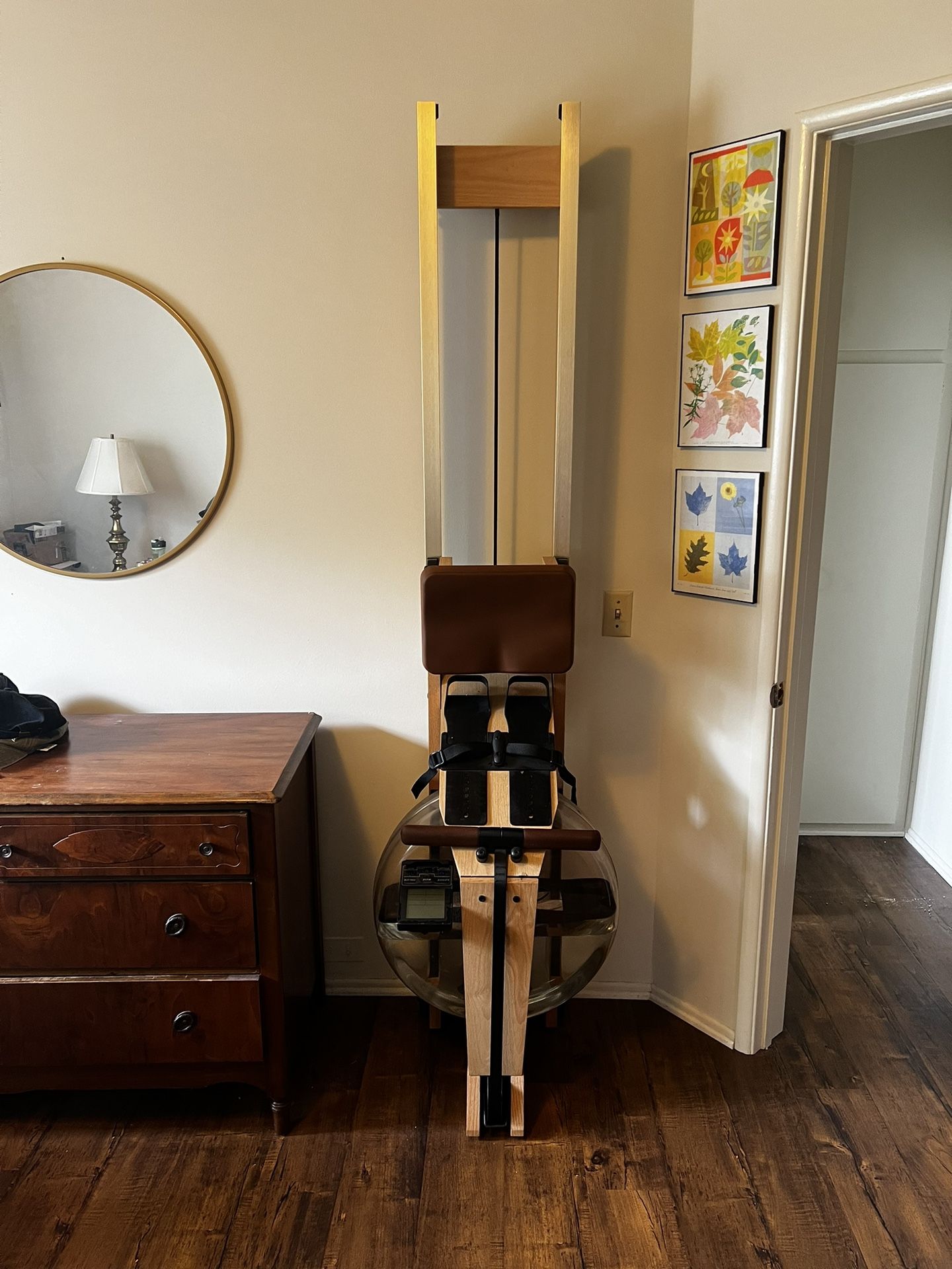 Really excellent rowing machine, perfect for apartment dwellers as it stands up when not in use and even looks kind of stylish depending on where you keep it. It’s on wheels and very moveable. You can adjust the resistance level by adjusting the water level, but I’ve stuck with their recommendation and it’s about exactly right. This thing is great. I’ve tried diff rowers and really recommend using a water rower.