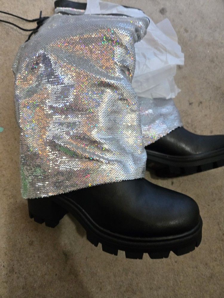 Brand new Glaze KURT-1 boots, never worn. Silver holographic sequins with chunky black sole. Perfect for raves, festivals, concerts, or cosplay. Size: Women’s 8 Condition: New Price: $20 Shiny, eye-catching, and super fun. First come!