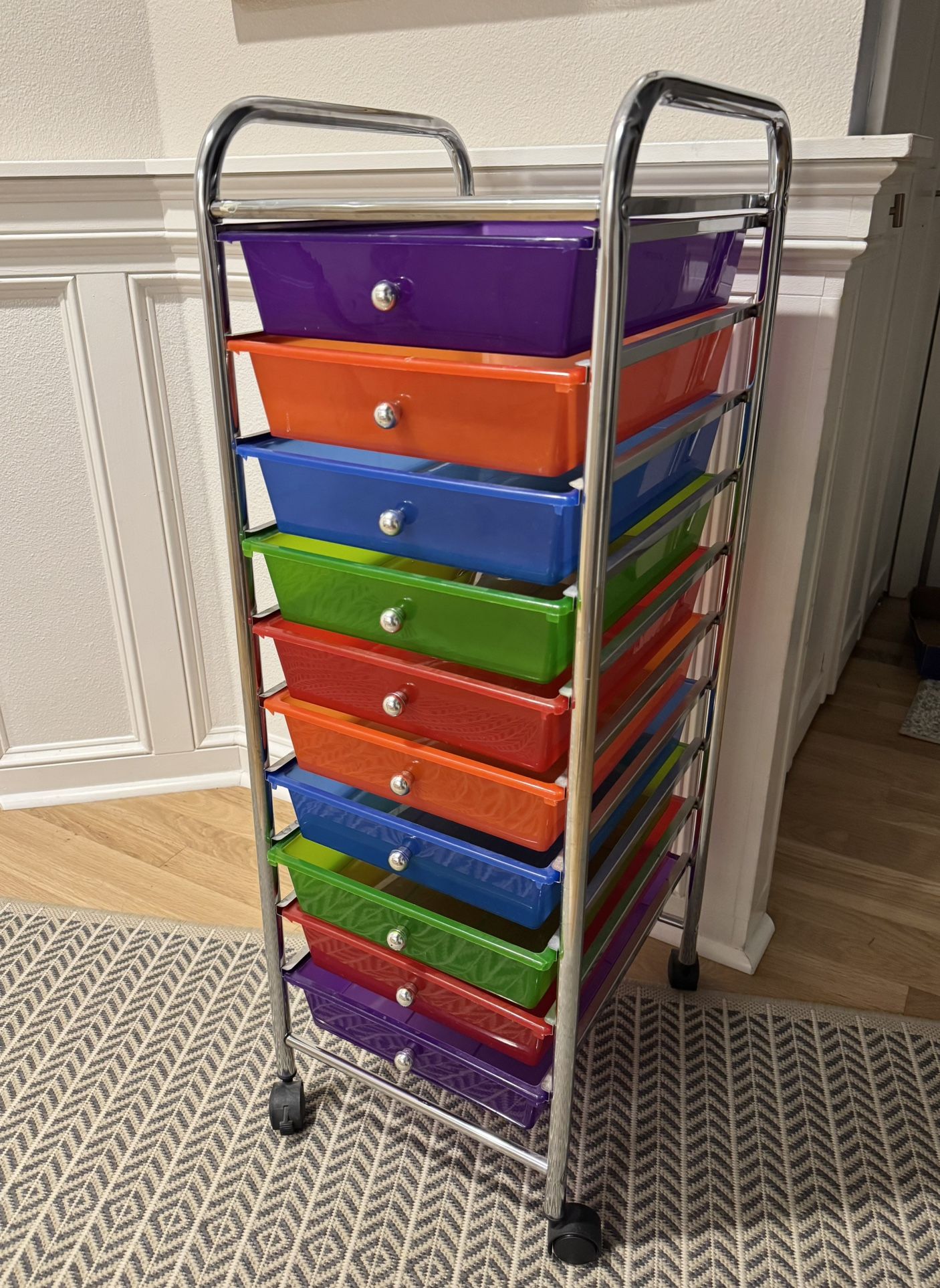 10 drawer rolling cart. Great for organizing crafts or papers etc. Bought it from Michael’s for $50 Dimensions: Width 12 1/2” Depth 15” Height 35” (with handles 38”)