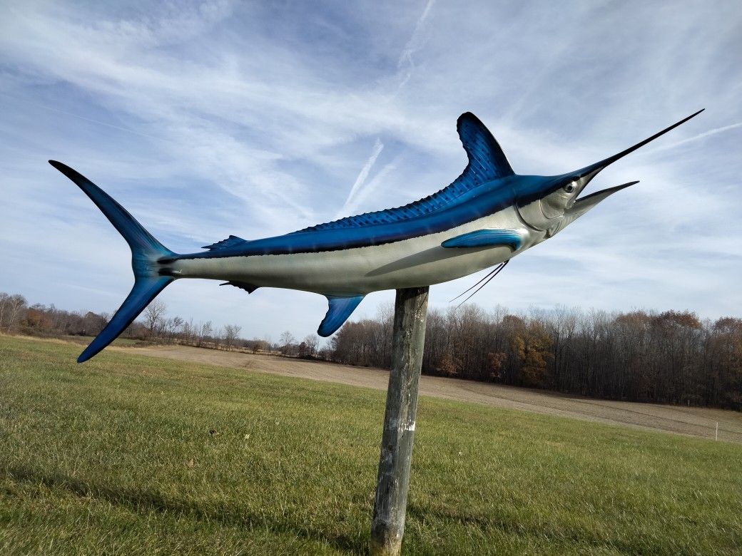 Would look great in that Man cave or office. Impressive Mount from the days of a Old Salts adventure on the Sea. Marlin is around 92" long from tip to tip. Back then She was crazy expensive well over $2000 to get her to the door. That was over 40 + years ago! Today? "ForGetAboutIt" Save a boatload of Clams and get a dam nice fish on the wall. Delivery is available. Cash only