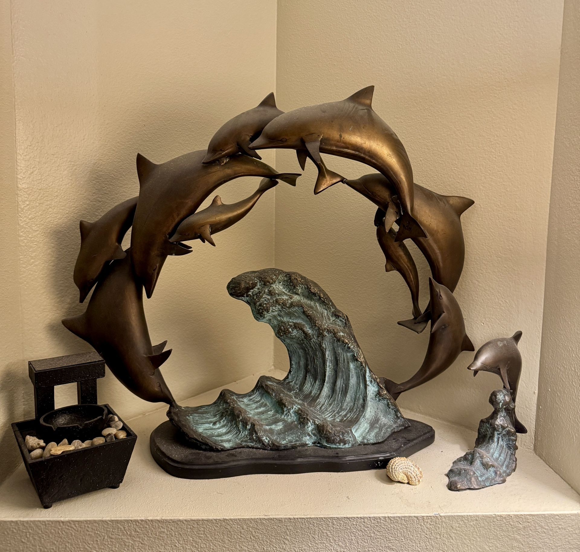 Pure Brass w/Solid wood Base Dolphin Sculpture Statute