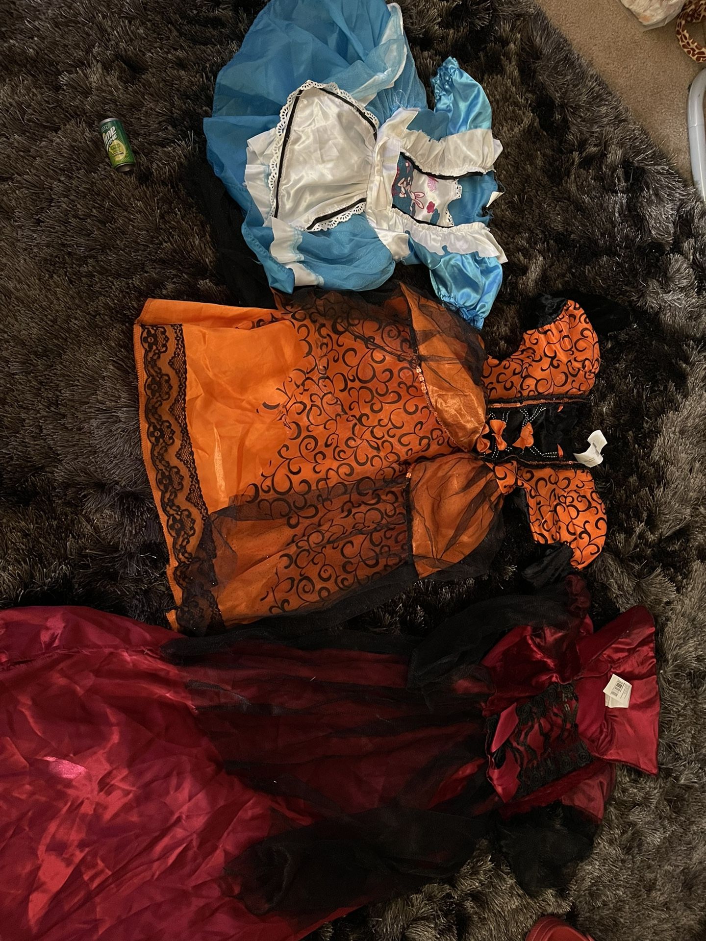 Scooby doo size medium 7-9 $20 Witch medium 8-10 $15 Kitty cat small 3-4 $10 Lady bug dress 12-18 months $10 Baby sheep lamb 12-18 months $20 Red onesie ladybug size 9 months $10 Pink baby bunny 6-12 months $15 Incredibles sizes medium 7-9 $10 Incredibles baby size 12 months $10 Orange witch size 7-8 $10 Red vampire size 8-10 $10 Alicia and wonderland 2t $10