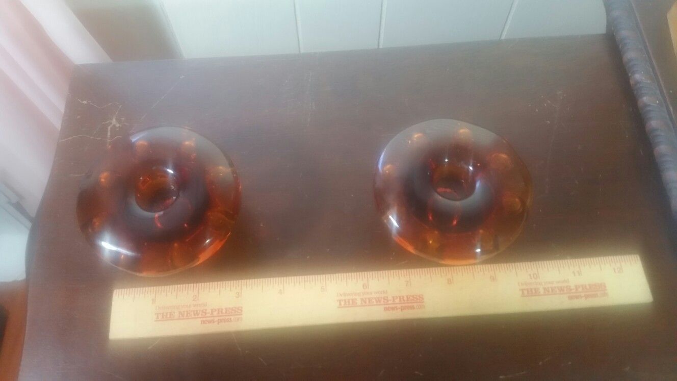 2 amber colored glass candle holders. In great condition Heavy, almost 1 lb each 3.5 inches wide by 2.25 inches high