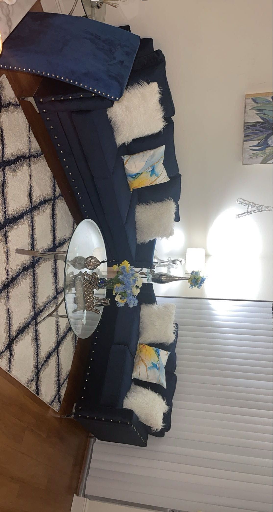 Beautiful blue velvet sofa set with silver studded detailing. Includes both sofas and decorative pillows for a complete glam living room look. Gently used and in excellent condition , only selling due to moving. Everything for $1500. Everything must go!!!