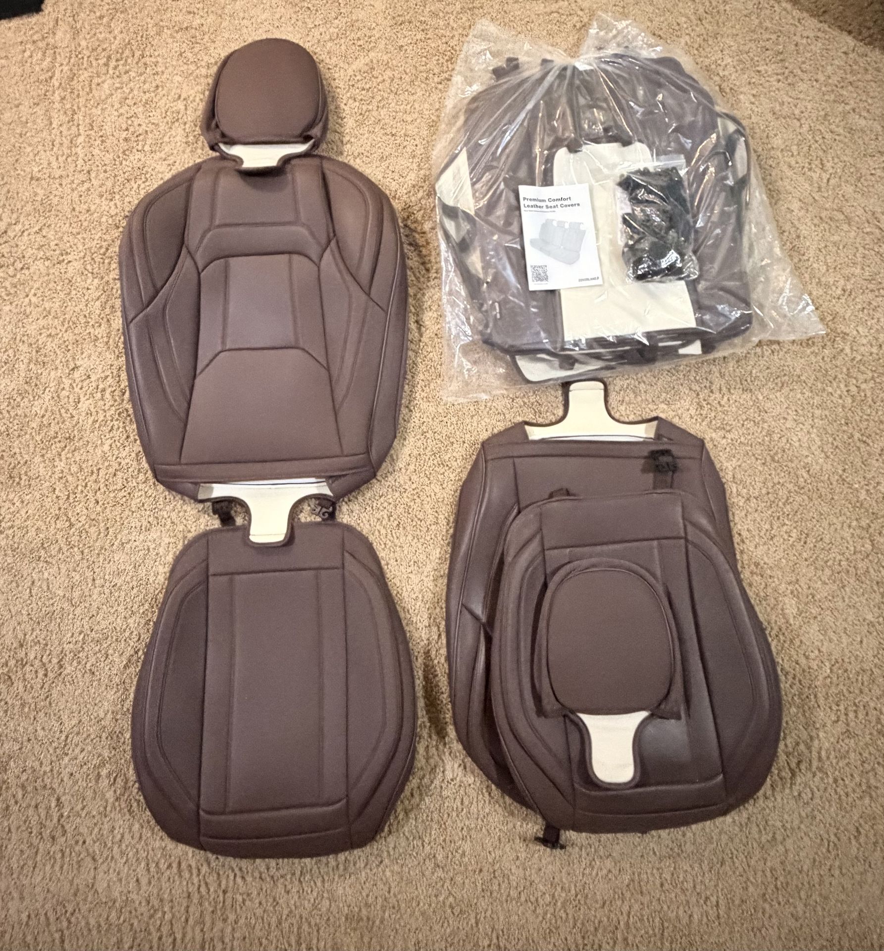 Honda Civic 10th Gen Brown Leather Seat Covers from CoverLand Easy installation probably take 30 minutes max. I had used the front seat covers for just about a week and took them off because my girlfriend didn't like them. The back Seat covers are unopened and comes with the original accessories and manual for install. they are high quality and feels very nice and comfortable as well as the front seats come with a little pocket in the front! The extra lumbar support is very nice as well for longer drives.