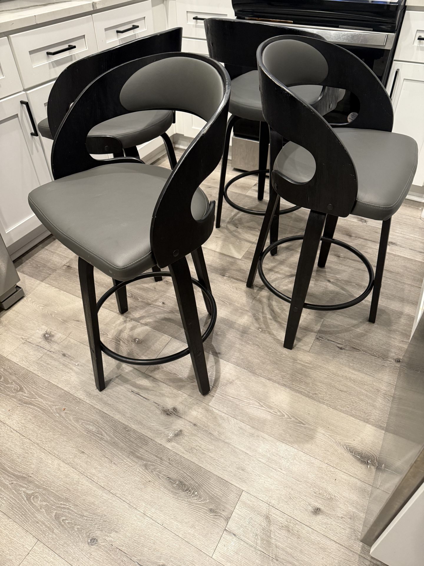 Set of 4 Armen Living bar stools in gray seats with sturdy wood and metal footrests. Very comfortable and modern style. Bought new from (about $150 each). We’re relocating.