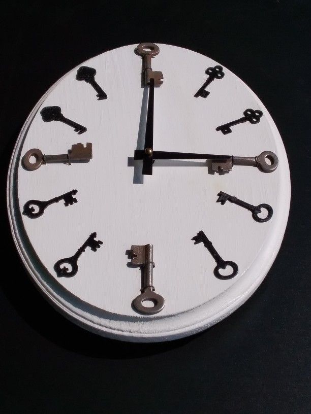 Skeleton Key clock. Measures 11-1/2"× 8-1/2". Vintage Skeleton keys on 12, 3, 6, 9. Wooden keys on the other numbers. Requires one AA battery.