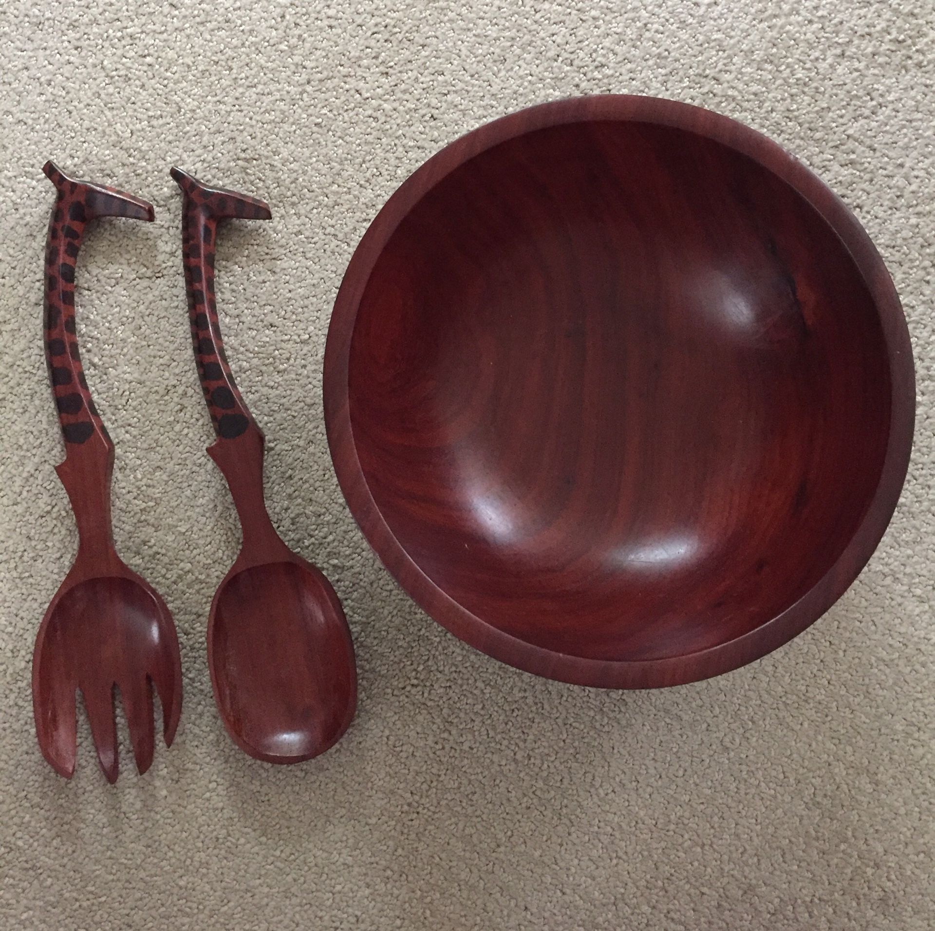 Wooden salad bowl set with servers. Beautiful red wood, could be used for decoration. Got these in Africa.
