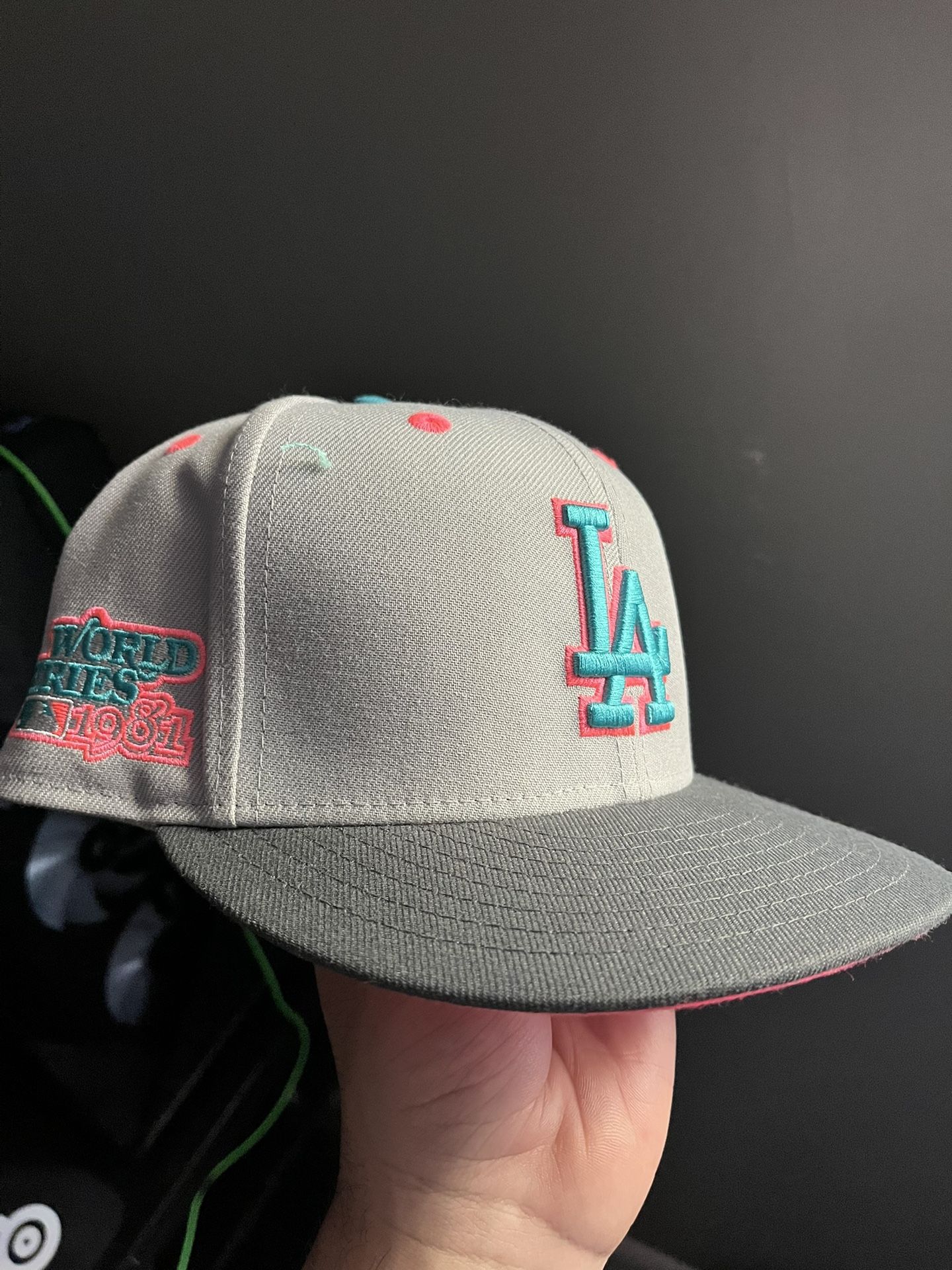 LA Dodgers 1981 WS Patch Fitted Hat Gray Pink UV