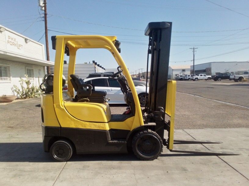 Forklift for Sale in Phoenix. Three-stage mast - 218" (18.16 feet) max forklift height, sideshifter with tilt functions, fingertip controls, 5000lb base capacity, cushion tires, propane fuel - Kubota engine, 48" forks, load back rest, monotrol, painted. This Hyster lift truck is in good working condition.