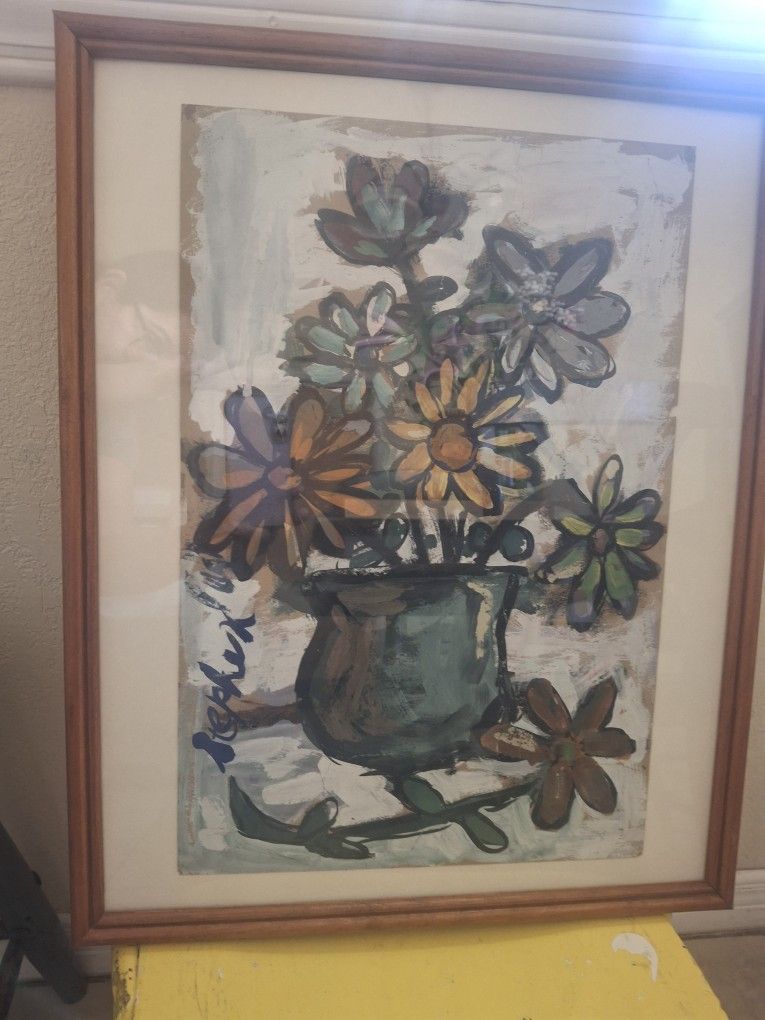 17x21 framed artwork signed Stephen '65. Mustard, steel blues, black, white, greens, some reddish pink undertones. Very good condition. Must pick up on the east side.