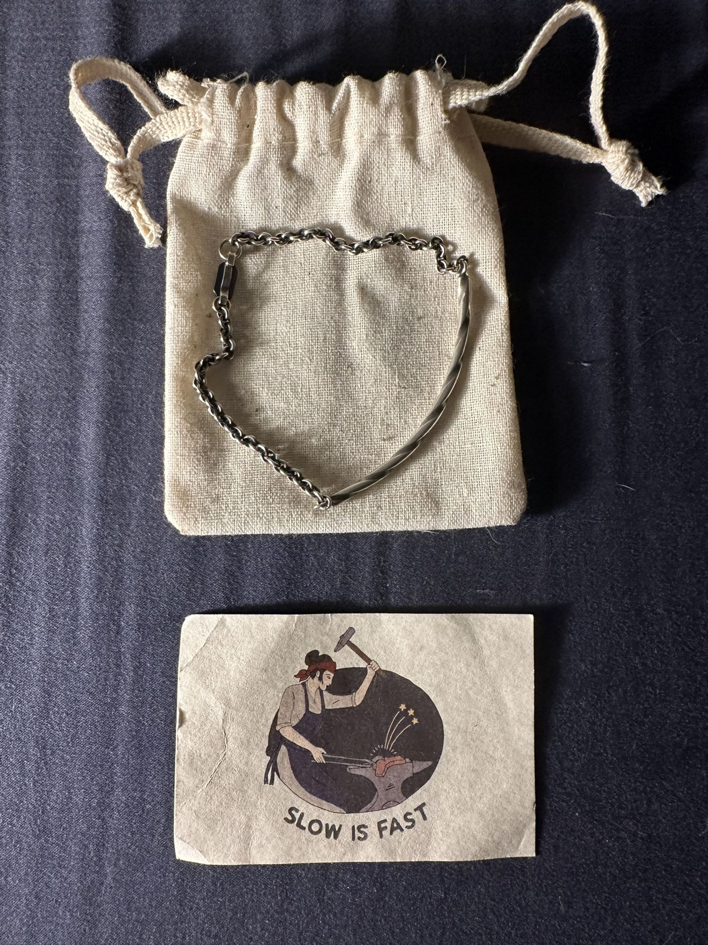 -Crafted in solid .925 sterling silver with our signature work patina finish -Handmade, tension based closure with crossed hammer hallmark -Thin, twisted "ID plate" style Follow same sizing as cuffs