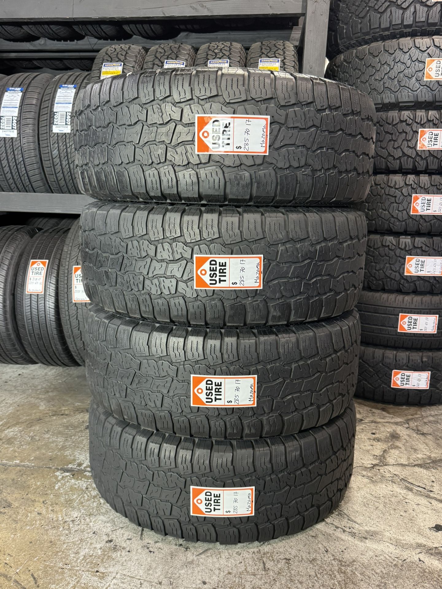 Set of 4 used 285/70/17 Mazama Tires Open Range A/T with about 50% life remaining. Installed and balanced included for $340. Located at Stone Tires. Two locations available. Message me for additional information. Hablamos Español