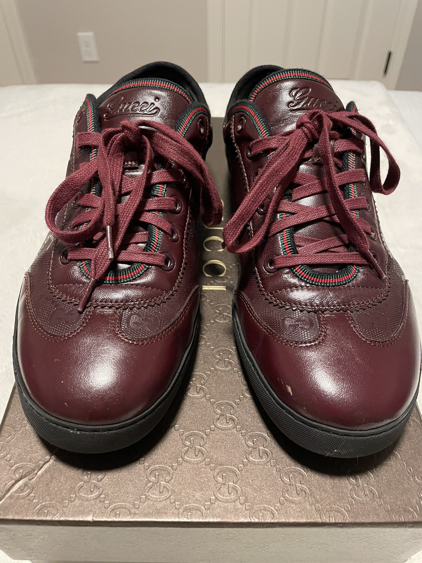 Burgundy leather Gucci monogram print sneakers. Shoe is in excellent condition; only wore once. Authentic; no flaws…EU size 7 US 8.5. I also have the matching belt