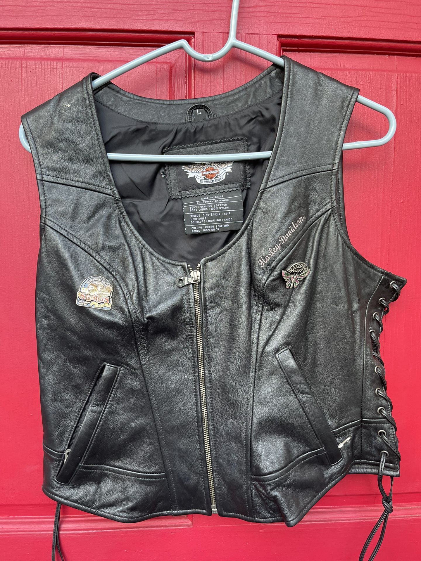 This beautiful Harley Davidson, leather vest war twice looks brand new size large women’s leather lace on the side located in Brandon Florida $50