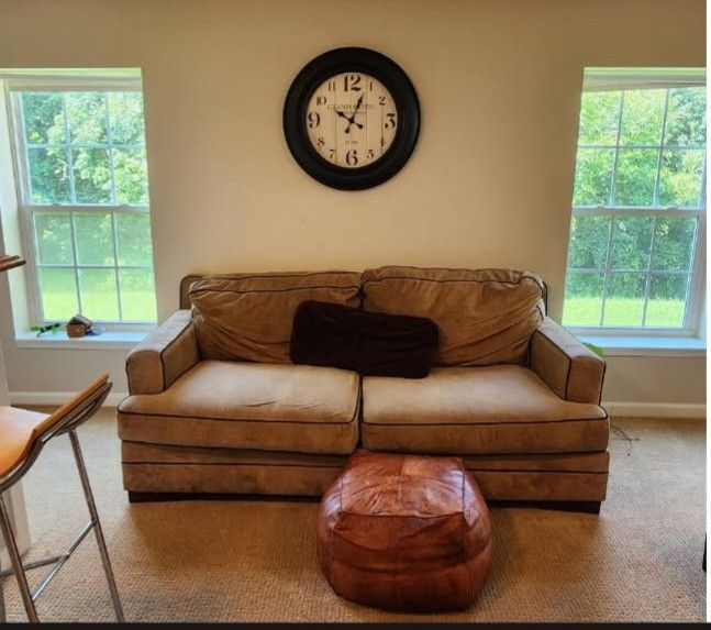 Soft, beige. I am told this looks much better in person & that the photo doesn't do this sofa justice. Will post more photos soon! :)