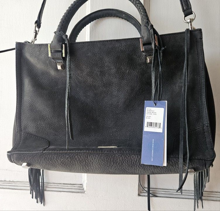 REBECCA MINKOFF BLACK LEATHER FRINGE REGAN SATCHEL TOTE BAG ADJUSTABLE CROSSBODY STRAP ( 14 1/2" X9" X3 1/2") INCHES WITH TAGS