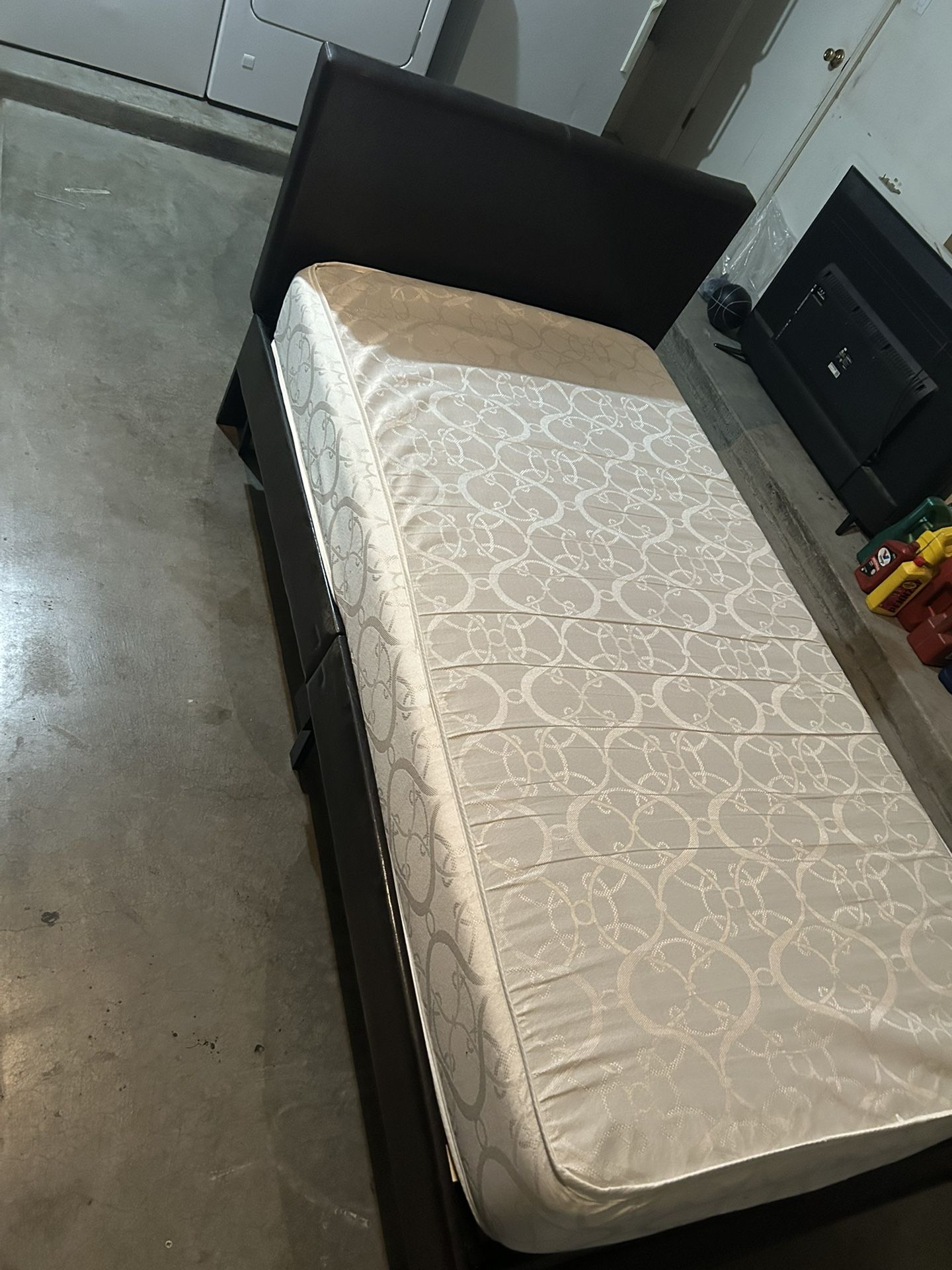 Twin size bed. Brand new never used. Brown Leather frame and headboard.