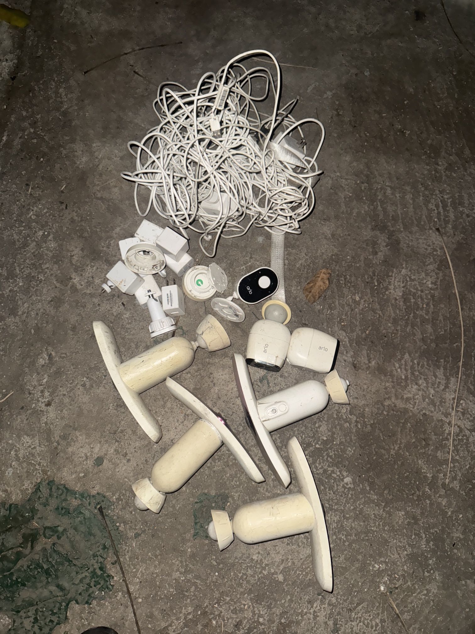 4 Floodlights all work , one has a coloring issue that comes in go but functions the same. Bunch of batteries and cables and three other cameras