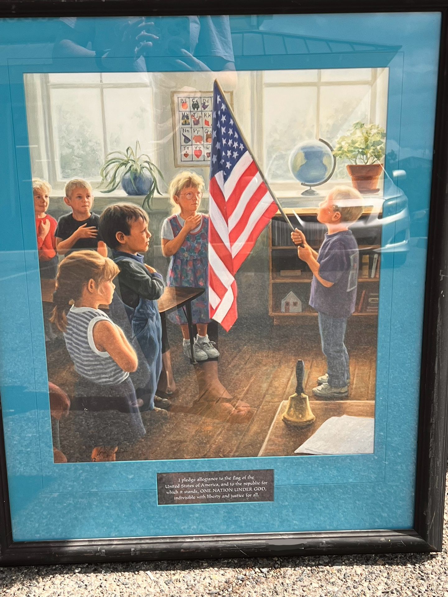 Attention Patriots. Here is a beautiful rendition of school children reciting The Pledge of Allegiance to the United States of America. This print done by renowned artist Robert Duncan is of a limited edition, #1130 of 1250 and is hand signed by the artist. The image (excluding the written pledge) is 20 in wide by 23 inches high. Hang this one with American pride. Frame may need to be replaced.