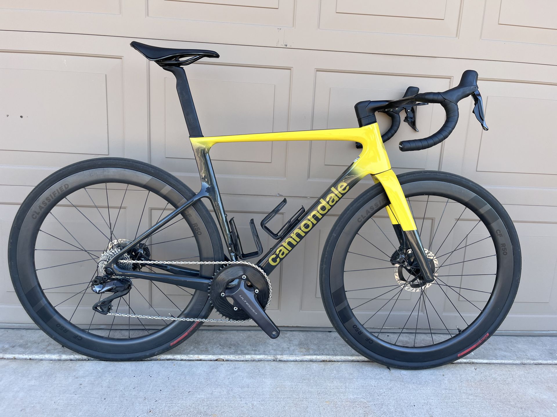 This is a genuinely special build on one of the best road frames money can buy. If you know, you know — and if you’ve been waiting for a high-end road bike done right, this is it. The Frame 2023 Cannondale SuperSix EVO Hi-MOD carbon in 54cm. Full integrated cable routing via Switchplate, flat mount disc, BSA threaded BB, 12x142 Syntace thru-axle, and SmartSense compatible. Matching Hi-MOD carbon fork with internal routing and 12x100mm Syntace thru-axle. This is Cannondale’s top-tier layup — light, stiff, and fast. The Drivetrain — The Real Story The centerpiece of this build is a Classified Powershift rear hub — a Bluetooth-actuated internal 2-speed hub that gives you the gear range of a 2x12 drivetrain with the clean, simple aesthetics of a 1x. Paired with a 50t Aeroad aluminum chainring up front and 12-speed out back, the left Di2 shifter controls the hub wirelessly. It’s seamless, fast, and genuinely clever tech. No front derailleur, no clutter — just a beautifully clean cockpit. Shifting duties are handled by Shimano Ultegra Di2, with electronic shifting front and rear (well, hub and cassette). Braking is also Ultegra Di2 hydraulic disc. The Build ∙ Momo Design integrated stem/handlebar — stunning and aero ∙ Specialized Romin saddle — brand new ∙ New seatpost ∙ Tubeless-ready wheelset with Classified hub ∙ 50t Aeroad aluminum front chainring Condition Lightly ridden. Built up and maintained by a former professional bike mechanic — everything was done correctly from day one. It shows. This bike is in excellent condition and rides absolutely flawlessly. Selling only because I’ve shifted focus to offroad riding and this deserves an owner who’ll actually put miles on it. Serious inquiries only. Local pickup preferred. Happy to answer any technical questions.