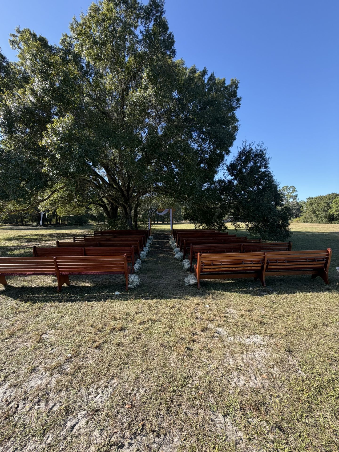 Beautiful wooden wedding arc and 14 church pews for sale in Fort Myers. Price is negotiable.