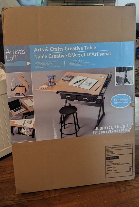 Artists loft arts and crafts creative table with stool. In box, never opened or used. Table surface, storage under table, art tray and cup holder for pencils, brushes and supplies. Four levelers for stability. Please review pictures. Non-smoking, climate controlled home.