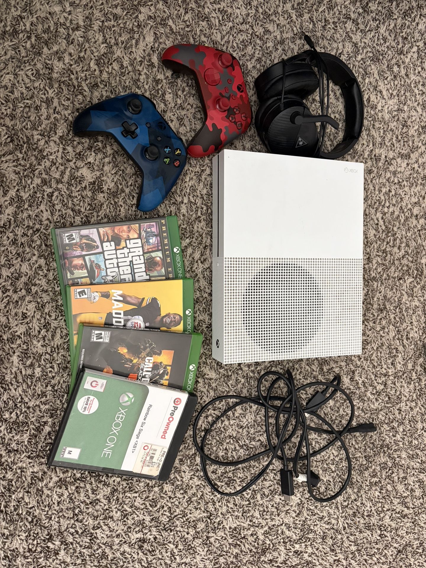 Xbox one S with two controllers, a headset, and 4 games. All comes together. All in pretty good condition. One controller is missing back piece. Everything works, everything turns on. Games are in good condition as well.