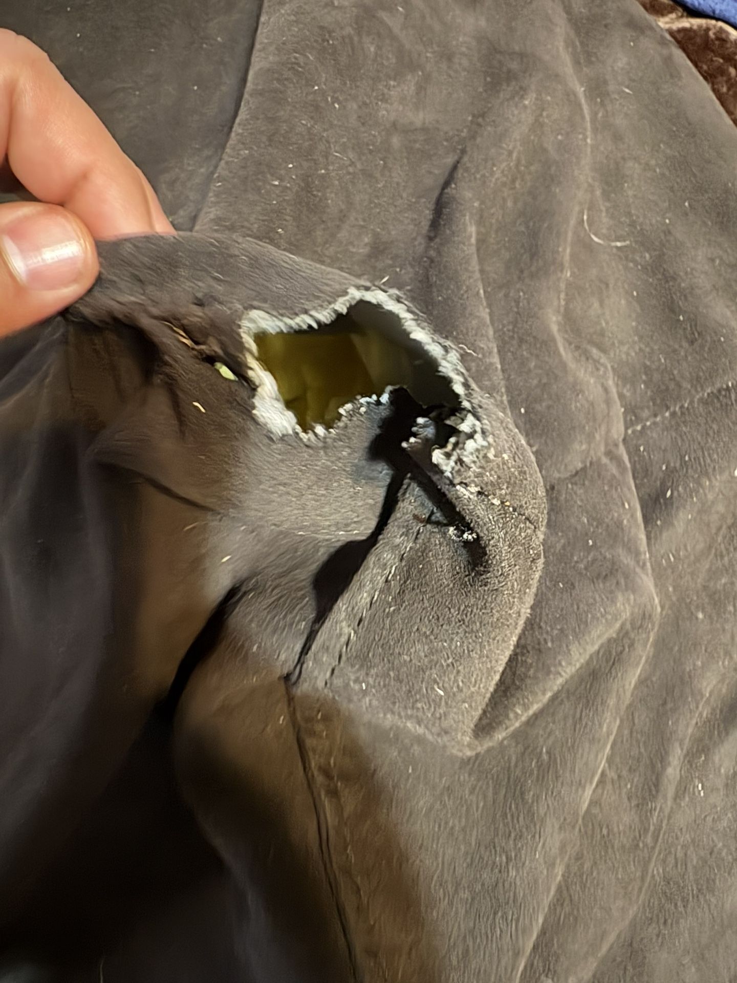 Selling this huge all black bean bag chair. It has two small holes that can be easily sewed together. The bean bag is huge can easily fit 2-3 people
