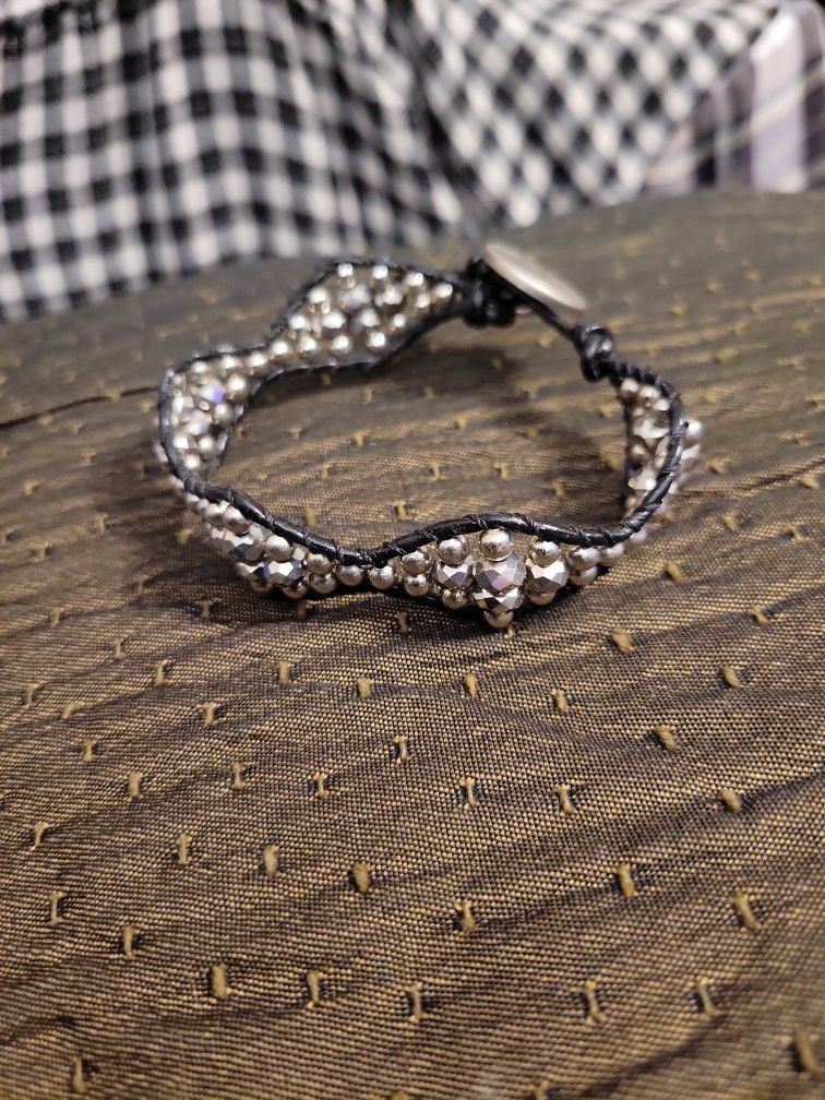 Double strand woven metal & hematite beads on a black cord. Clasps with round button engraved with a butterfly. Like new condition.