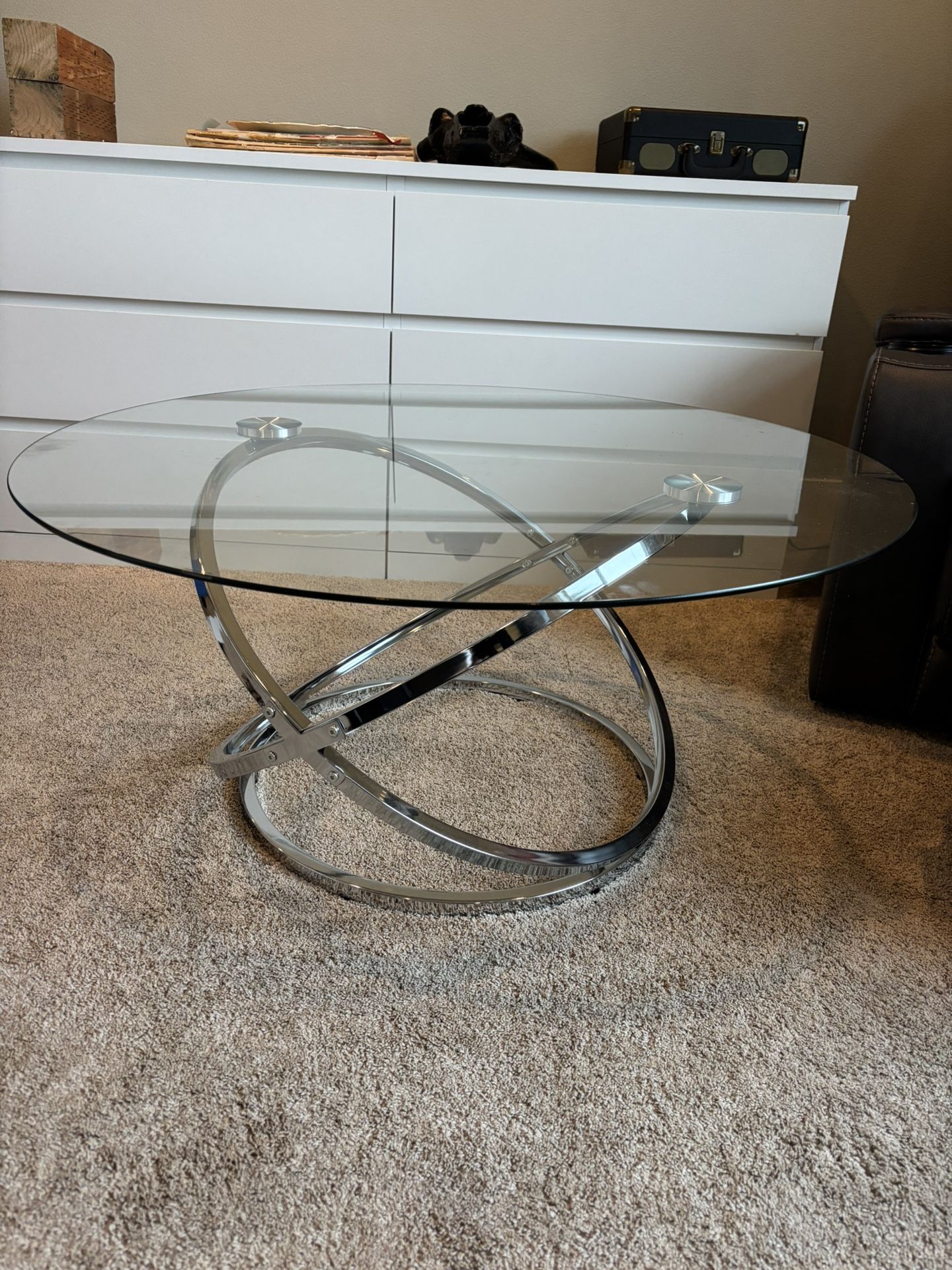 Round glass and metal coffee table Brand new! We missed the return window it didn’t fit our space About 3-3.5 feet in diameter