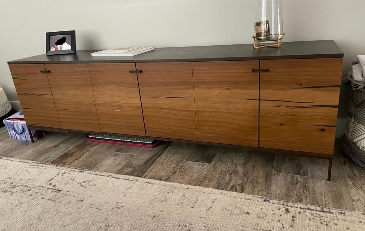 Stunning Four Hands Cuzco media console in natural yukas finish. This is a high-end designer piece originally purchased from Burke Decor for around $4,000. Beautiful wood grain with modern iron detailing and tons of storage. Gently used and in very good condition with only a few minor surface scratches. Currently stored in a storage unit and ready for pickup. Heavy, solid piece—bring help for loading. Asking $1,400 OBO. Width 78"x Depth 18"x Height 24" Cross streets for our storage unit for pickup at Shea & Scottsdale