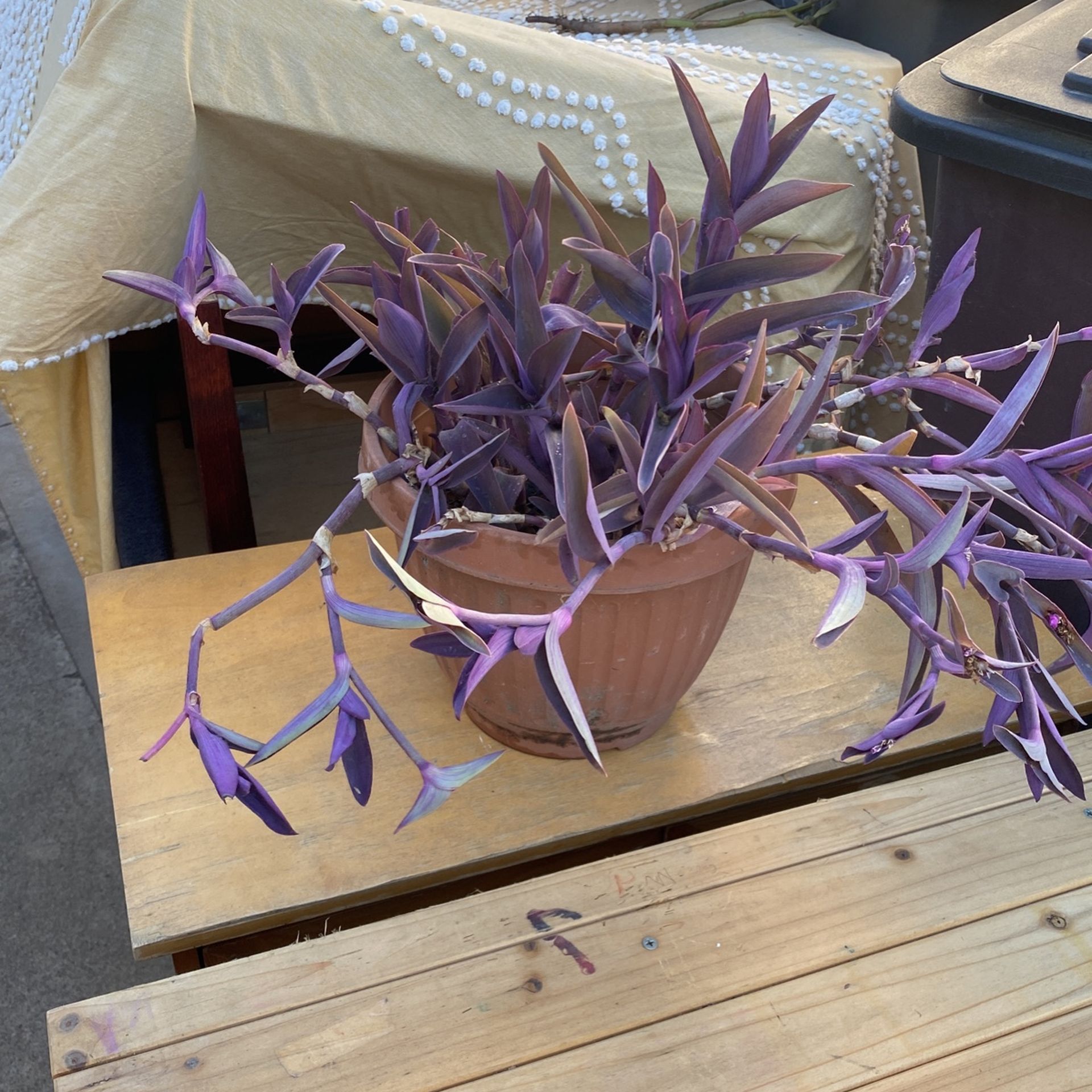 Healthy survivor potted plant also referred to as Transcantia “Purple Heart” Variegated. This plant is full and mature and produces small pink flowers mid-summer to fall. Also can go for a while without water if it gets ignored a bit