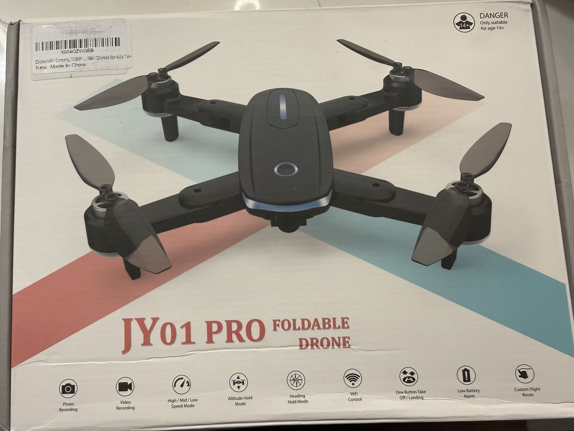 JY01 PRO Foldable Drone X4 Kit featuring a foldable drone with a 4K UHD camera and dedicated remote controller. This advanced quadcopter offers ultra-high-definition aerial photography and video in a compact, portable design. The kit includes the foldable drone, rechargeable battery, and a sleek remote for precise flight control. Perfect for hobbyists looking for professional-grade resolution and easy transport. Brand new in box, ready for flight.