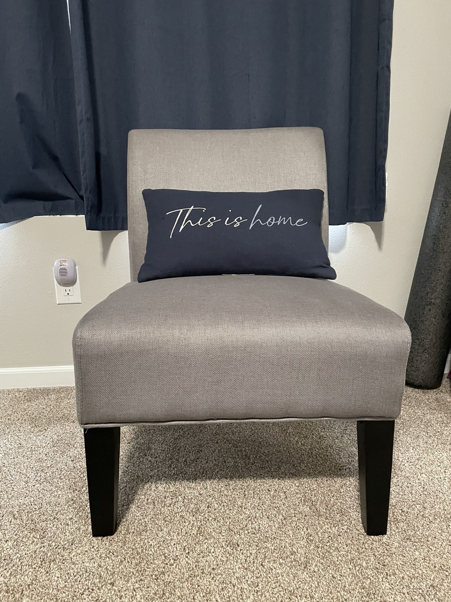 Grey and black accent chair. Minimal use. Slight wear on legs. Width: 23 inches Depth: 25 inches Height of seat: 16 inches Height to back: 32 inches
