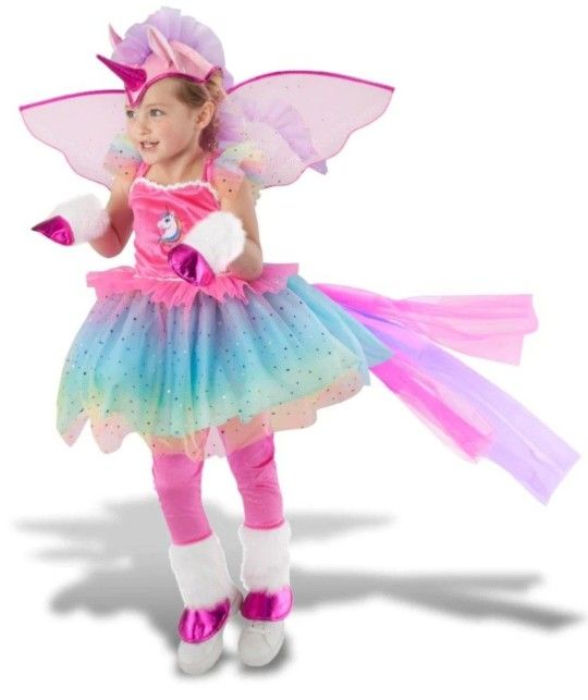 Brand new! Size 7-8 Elusive unicorns are rare to glimpse. Rarer still are those with wings to fly. As you’ve surely guessed, my perceptive young friend, this colourful winged unicorn is the rarest and cutest of all. Includes 6 pieces: Unicorn dress with attached tail Furry hoof wrist-cuffs Velvet leggings with furry hoof cuffs Accessories include: Unicorn wings Unicorn headpiece