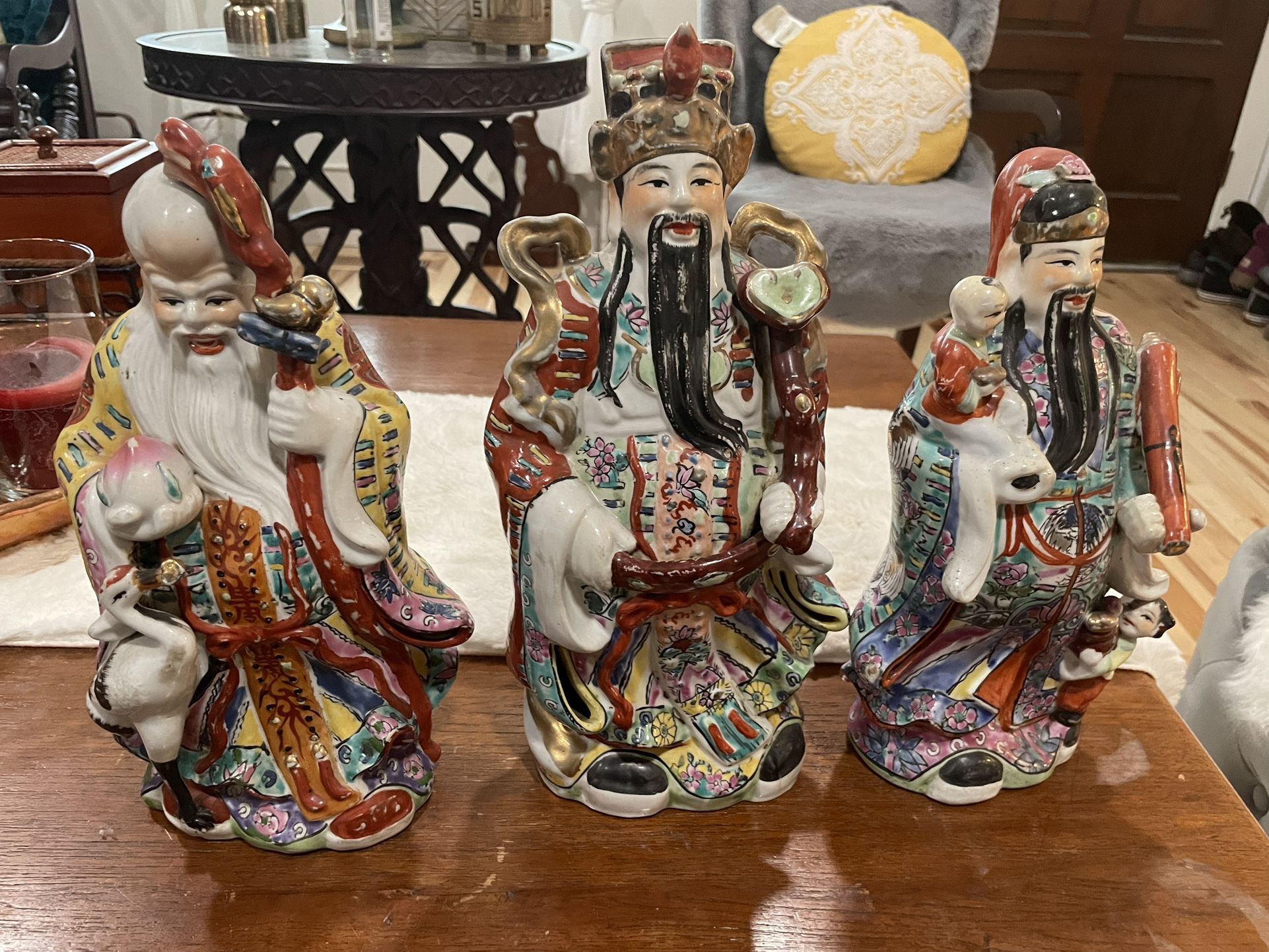 Vintage 3-12" Chinese Sanxing Gods | Colorful Porcelain Figurines | Wise Men Fu Lu Shou | The 3 Stars: Prosperity, Status, and Longevity Bought these in Taiwan. Perfect condition, antique.