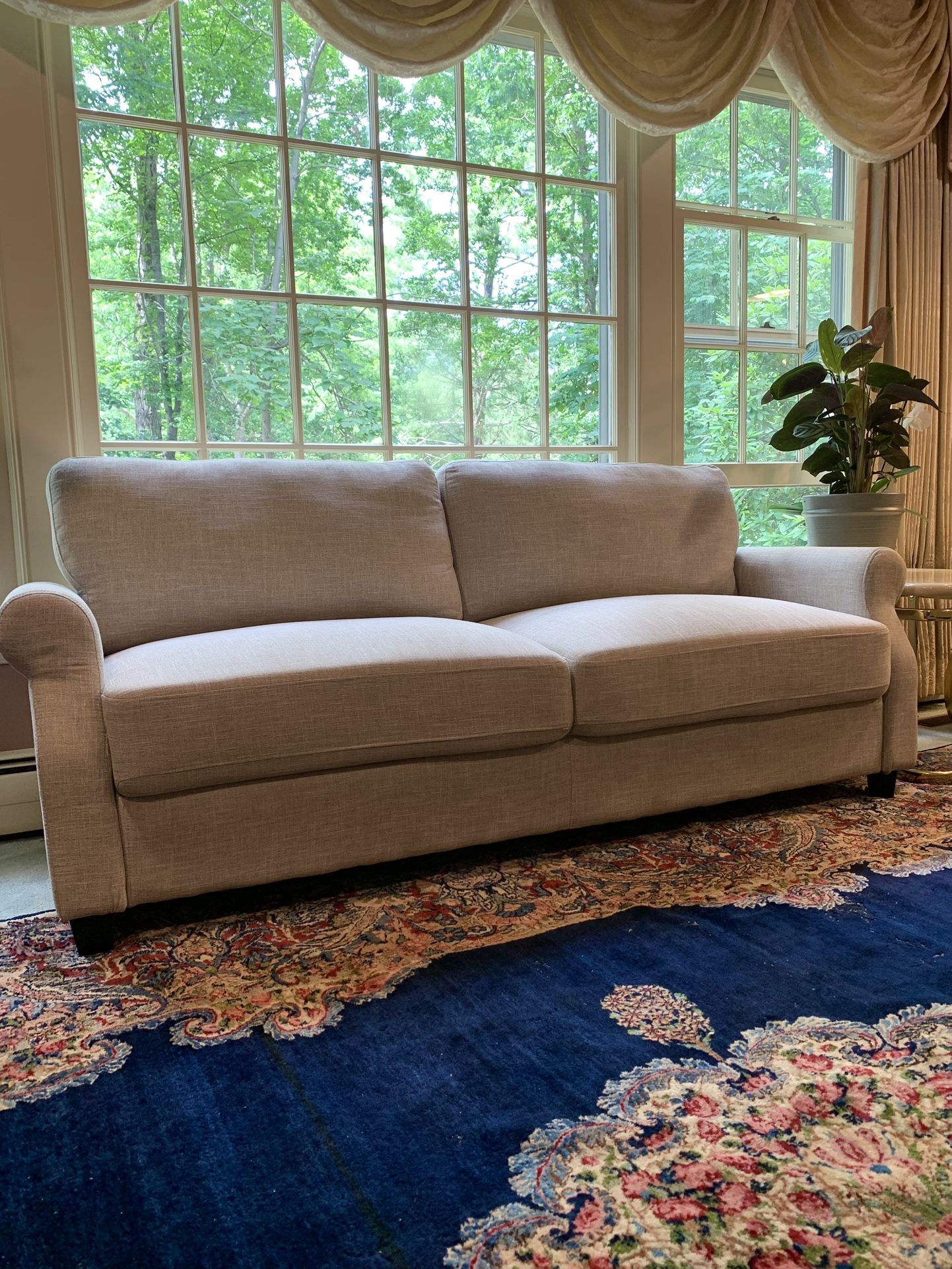 Beautiful modern stylish and comfortable sofa. This beautiful Zinus sofa in a neutral light beige fabric fits perfectly in any room. Gently used and in fantastic shape — no stains, rips, or sagging cushions. Dimensions in the photos. Seats 3 comfortably. Durable upholstery, easy to clean. Classic rolled arms and sleek design. Sturdy wooden legs. Pillows not included. Smoke-free, pet-free home. Perfect for a living room, office, or sunroom! 'YES' it is available if you see the listing. Message to schedule pickup. Greensboro pickup. Cash only.