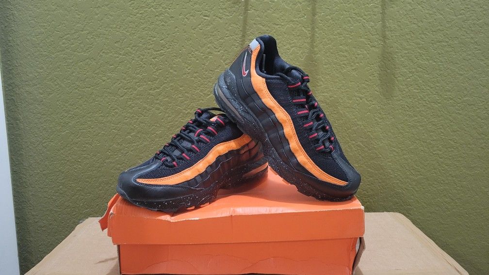 Pair of Nike Air Max '95 (GS) (Grade School) sneakers in the Black/Dark Red-Orange Blaze-Stealth color. The specific identifying information for these shoes is: Model: Nike Air Max 95 (GS) Style Code: 307565-064 Colorway: Black/Dark Red-Orange Blaze-Stealth (Noir/RFON-Osolei-Grissr) Size: US 5.5Y (equivalent to UK 5, BR 36) Worn about five times. Slight damage on right shoe sole (pictured). In great condition.