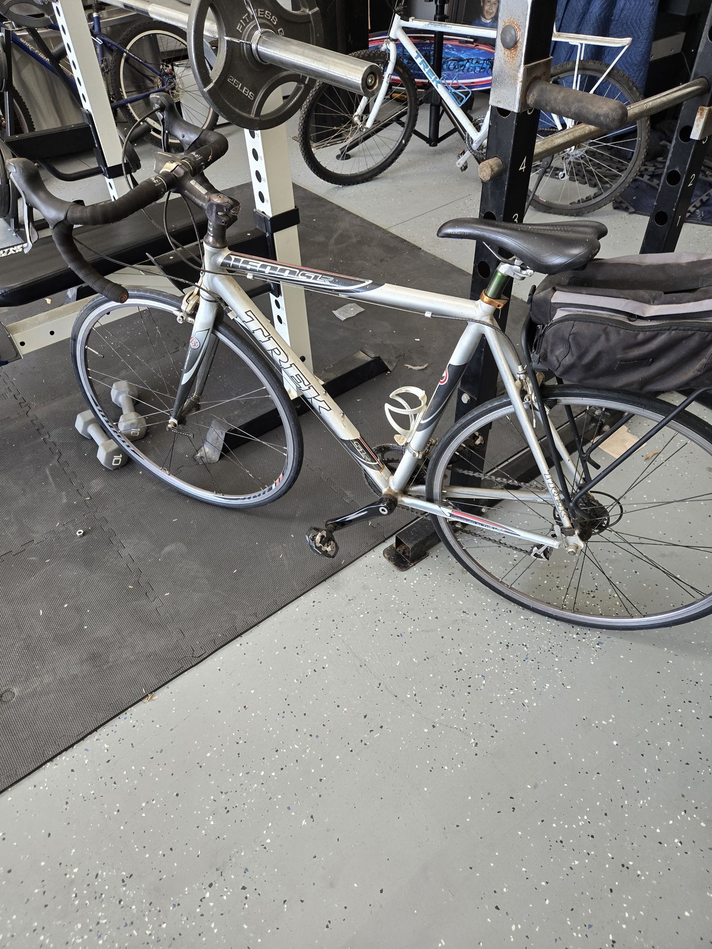 Trek Bicycle 1600SLR with clip on pedals. Road bag & headlamp Pic of tire size on last photo. My dad bought with the intention of riding, but he prefers his mountain bike and the slower pace.