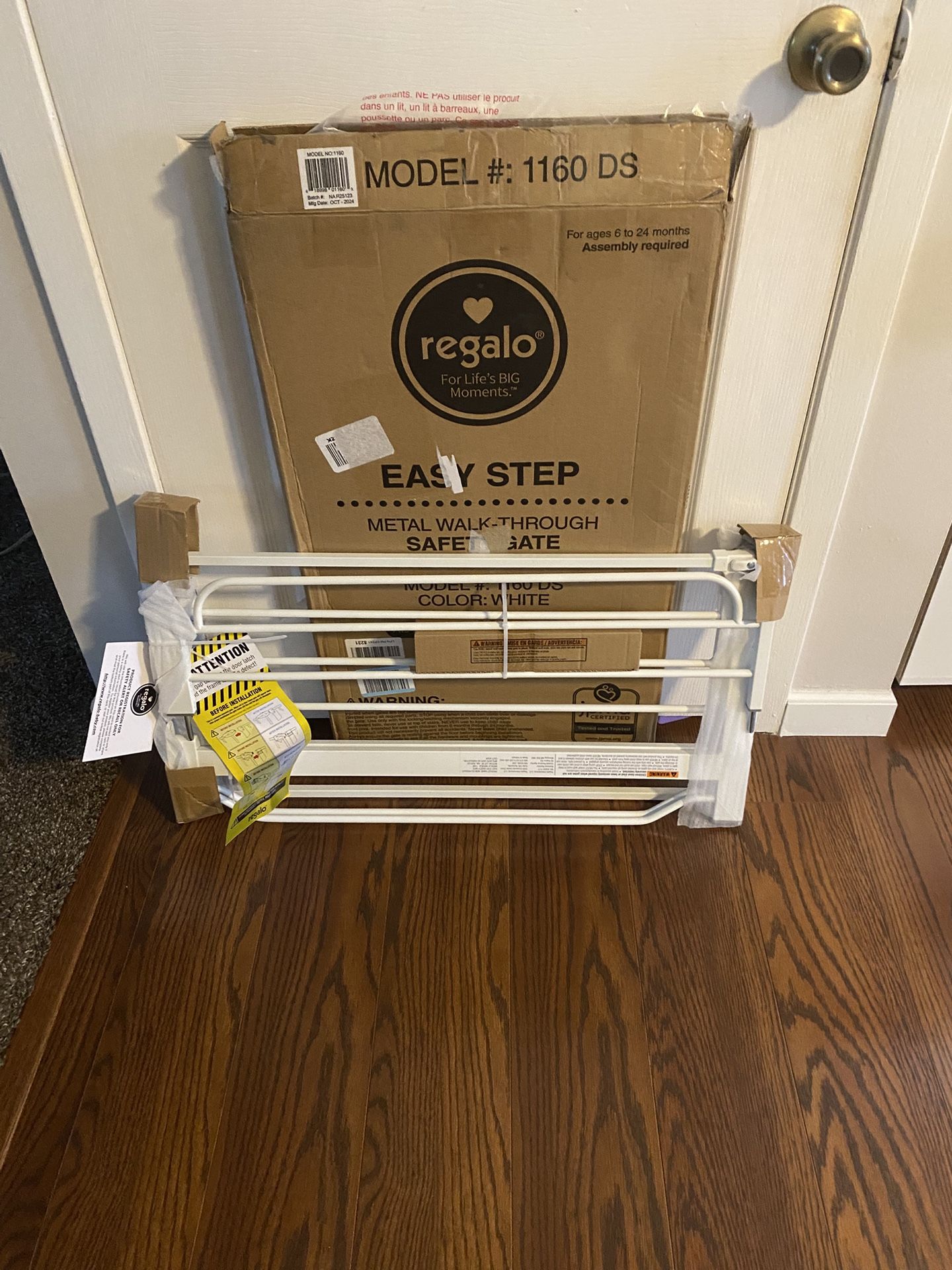 Regalo Easy Step Metal walk-thru safety gate. White, dimensions and features shown in photos. Never used, taken out of box for photos. Cash only please.