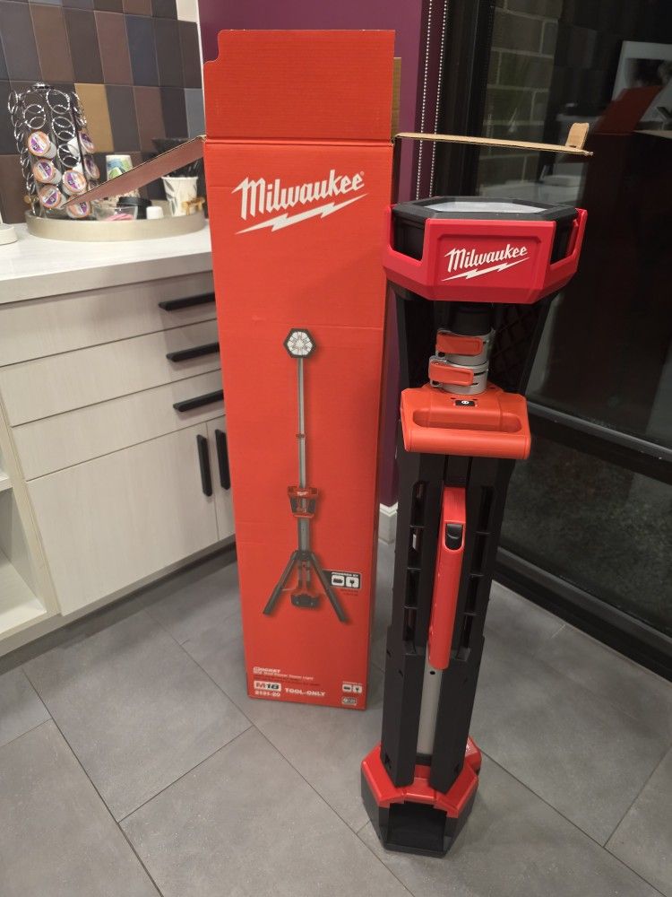Brand New Never Been Used Milwaukee M18 Cordless Rocket Dual Power Tower Light (Tool-Only) The MILWAUKEE M18 ROCKET Dual Power Tower Light provides 25% More Light and All Day Operation. The LED light tower has Dual Power capability and delivers 2500 lumens of TRUEVIEW High Definition Output. Users can choose to power this tower light with Milwaukee M18 batteries or by an extension cord for maximum versatility. The LED light tower is capable of filling large areas, extending from 4 to 7 feet and providing 2,500 lumens of TRUEVIEW light output in high mode, 1,100 in medium, and 700 in low. The portable light tower has reinforced legs that are impact-resistant, and a low center of gravity for a stable base. The LED light head is protected by an impact-resistant lens and bezel, nested in a protective shroud for secure transport and storage. The LEDs never need to be replaced and are backed by a limited lifetime warranty. Milwaukee ROCKET Tower Lights are designed to deploy in seconds and built to adapt to any job site environment. The LED light towers supply both task and area lighting as well as provide light overhead to reduce shadows in the workspace.