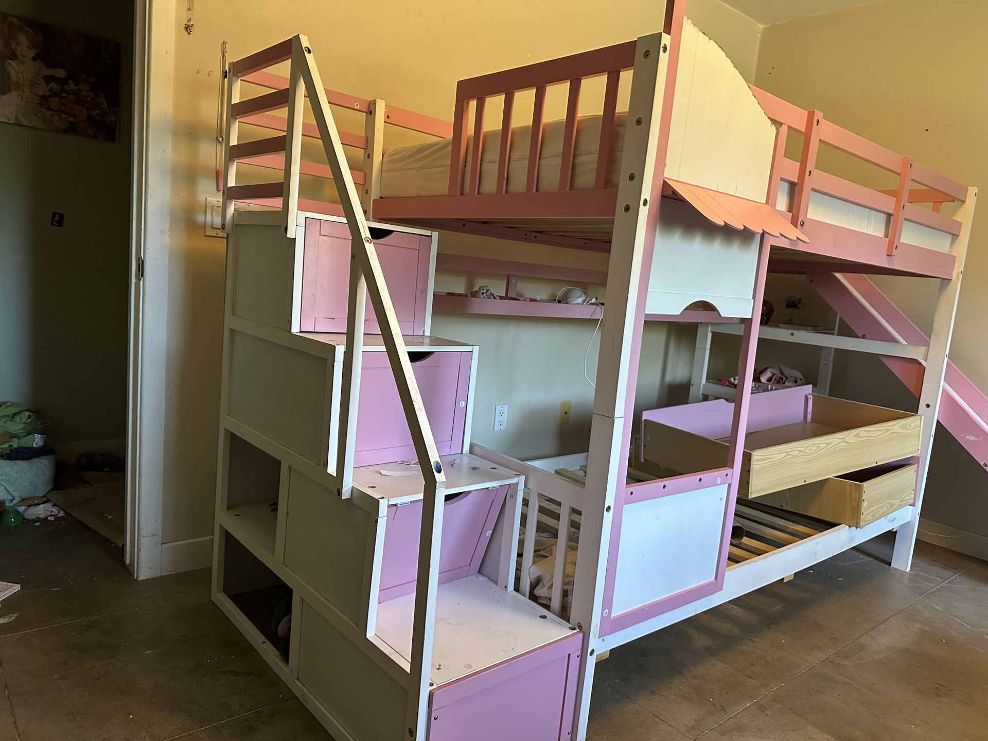 Bunk bed with stairs, lots of storage, built in shelving ($200 if you take apart)