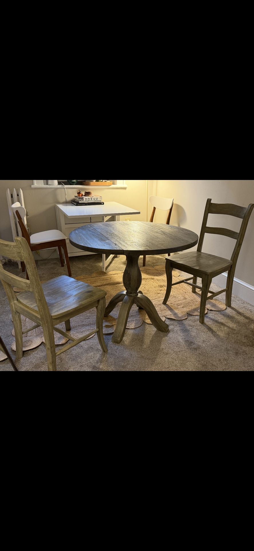 Barely used small dining table and two chairs, made of real wood, and in excellent condition. Bought new just two months ago.