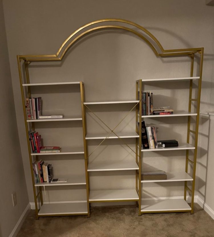 Gold Bookshelf Arched Book Shelf, 79” Triple Arch Bookcase White faux wood shelves Wood would need to be wiped off Good condition Normal wear Purchased from Amazon no longer available there almost 2 years old still looks great Pick up in Laveen AZ no delivery available thanks ! Open to offers !
