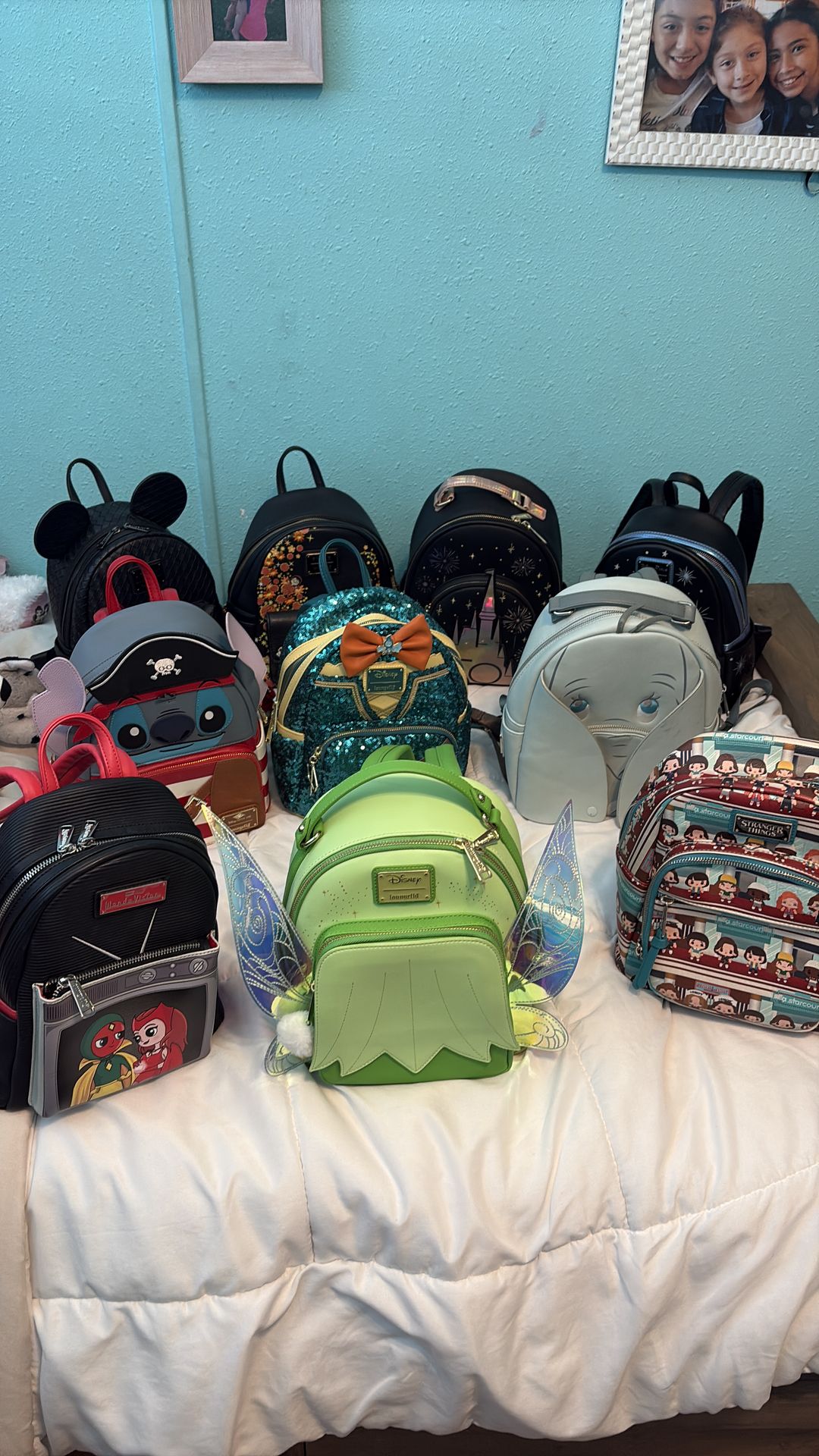 All bags well taken care of and rarely used. Selling all bags for $600 or buy individual bags for price listed below. Tinker bell: $100 Coco: $90 Dumbo: $50 Stitch: $110 50th year: $70 Disneyland resort: $60 Brave: $80 Black: $60 Stranger things: $70 WandaVision: $80