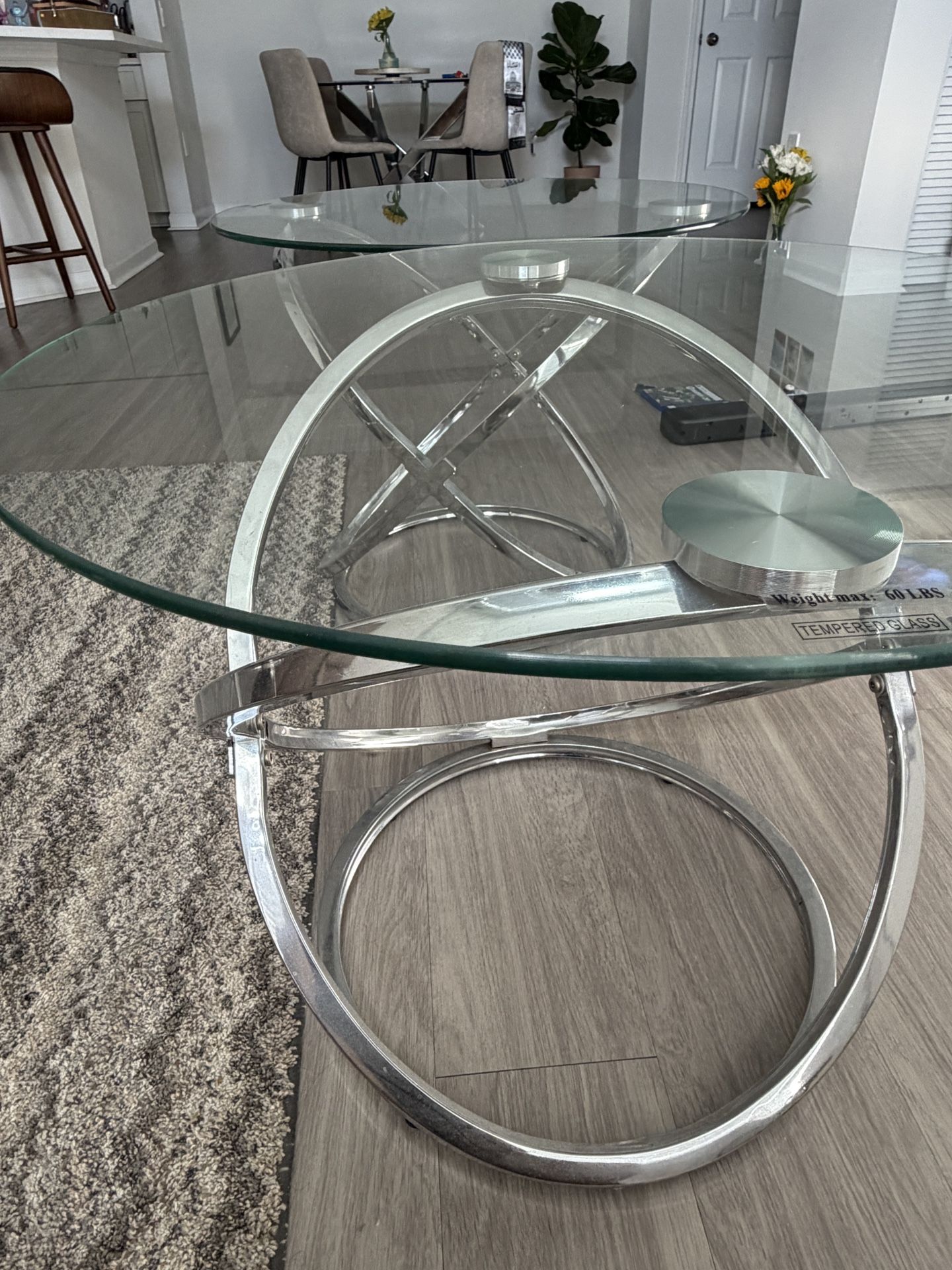 Modern Glass Nesting Tables (Set of 2) – Chrome Base 100$ Each Sleek modern nesting tables featuring clear tempered glass tops and a chrome metal circular base design. Can be used together or separately as coffee tables, side tables, or accent tables. Clean, minimalist look that fits perfectly in contemporary or modern spaces. ✔ Set of two nesting tables ✔ Clear tempered glass ✔ Chrome/silver metal bases ✔ Space-saving design ✔ No cracks or chips ✔ Excellent condition Perfect for apartments, living rooms, or offices. Pickup only.