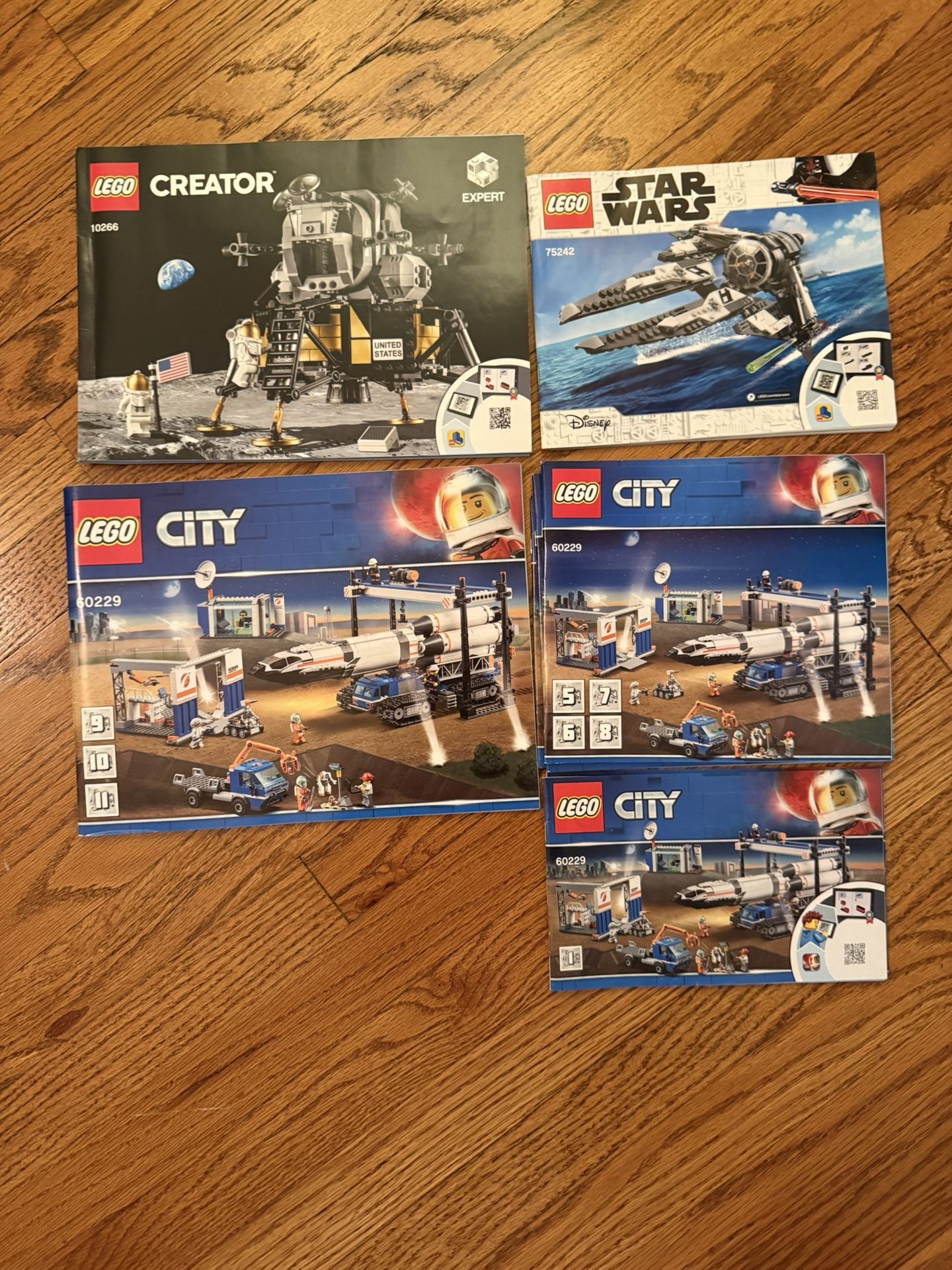 Selling a bundle of LEGO sets. Pieces are currently mixed together in one bin, but the instruction manuals are included (see photo). Great if you want to rebuild the sets or use for parts. Included manuals/sets: * Creator Expert Lunar Lander (10266) * Star Wars set (75242) * LEGO City Space Rocket Launch Center (60229)